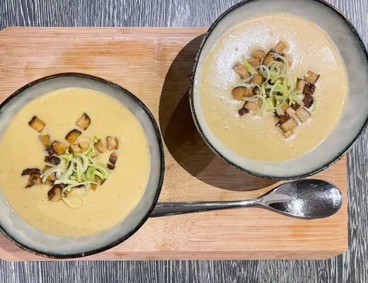 Herzhafte, cremige vegane Käse-Kartoffel-Lauch-Suppe mit knusprigem Räuchertofu-Topping. Wärmendes Wohlfühlrezept mit Cashews & Gemüse …