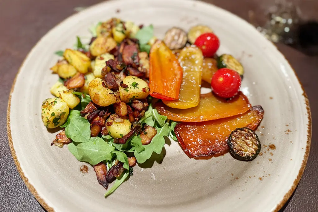 - Kürbis-Tortellini mit Cashewkernen, Kirschtomaten / Bratkartoffeln mit gemischten Pilzen, gegrilltem Gemüse