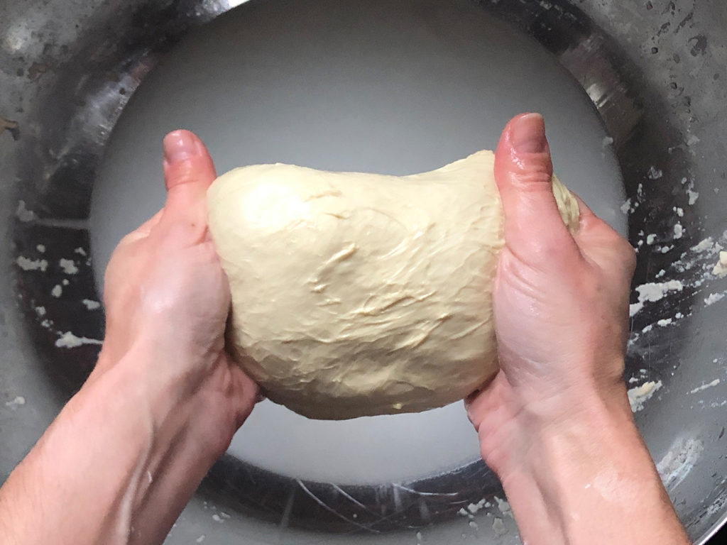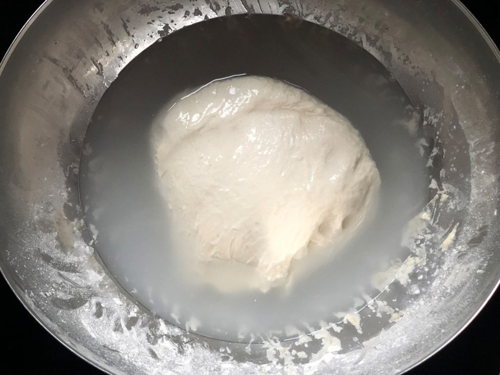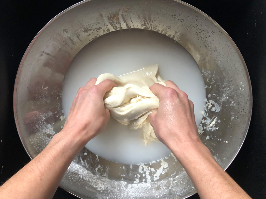 Knete aus Mehl und Wasser einen elastischen Teig, der nicht mehr an den Fingern klebt. Das dauert etwa 10 Minuten. Lege den Teig nun in eine Schale mit kaltem Wasser. Der Teig sollte ganz mit Wasser bedeckt sein. Stelle die Schale für eine Stunde in den Kühlschrank.