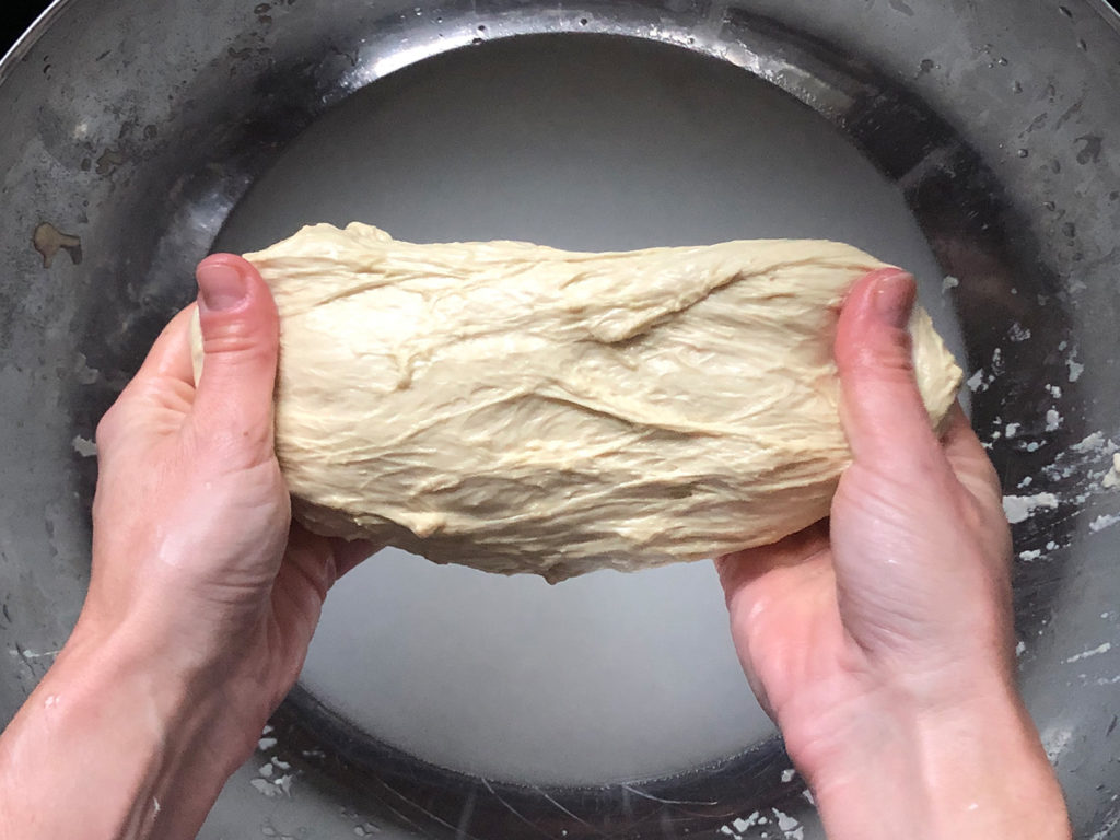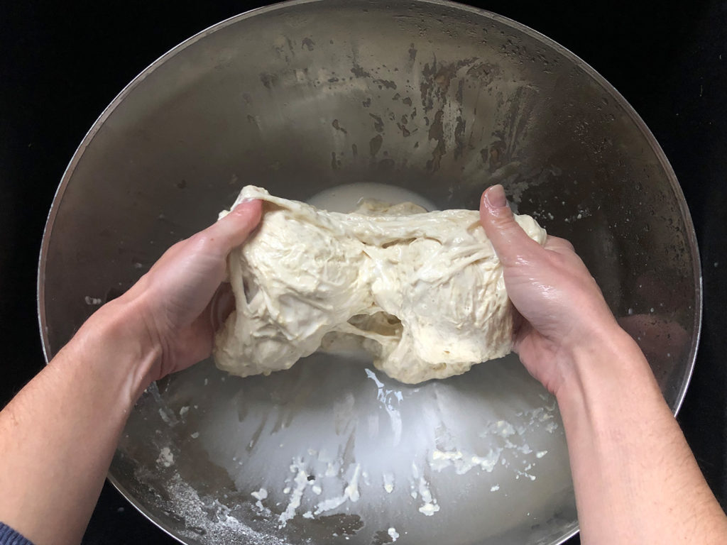 Nach einigen Minuten in dem „flitschigen“ Zustand gewinnt der Teig wieder an Struktur und wird fest und elastisch.