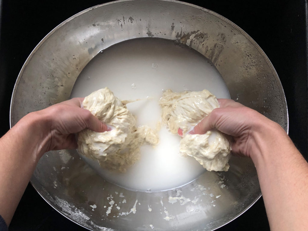 Nun wird das Wasser nicht mehr ganz so milchig, denn die meiste Stärke ist bereits ausgewaschen. Untersuche den Teig nach letzten Stärke-Klümpchen und wasche weiter, bis das Wasser so gut wie klar bleibt. Jetzt hältst du deinen ersten rohen Seitan in den Händen.