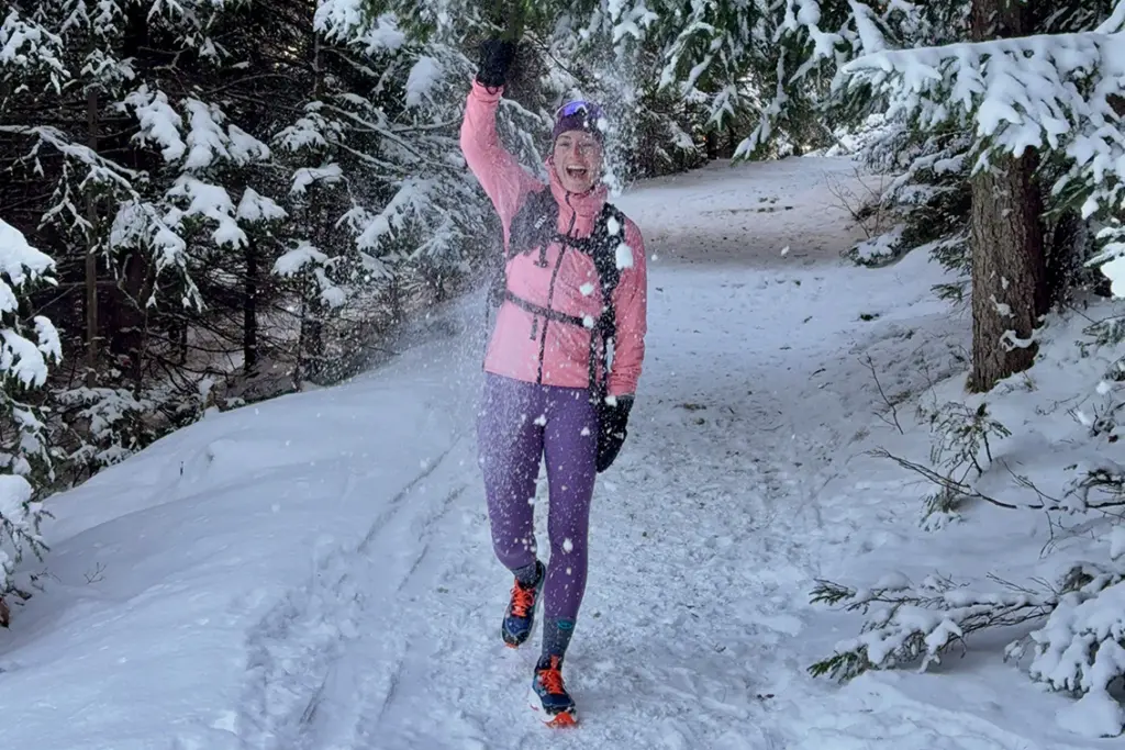Trage technische Socken für warme, trockene Füße beim Winter Trailrunning.