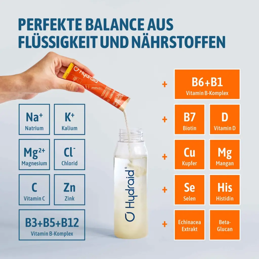 Hier kommt der Hydration Helper® PLUS Immunity ins Spiel – nach dem Motto „Hydration meets Immunity“. Hydraid kombiniert dafür die bekannte Elektrolyt-Basis (mit Natrium + Glukose für bessere Wasseraufnahme) mit einer „Winter-Formel“ aus Vitamin C, Vitamin D, Zink, Selen und Kupfer – also genau den Nährstoffen, die zur normalen Funktion des Immunsystems beitragen. Dazu kommen Echinacea-Extrakt und Beta-Glucane als zusätzliche Bausteine.