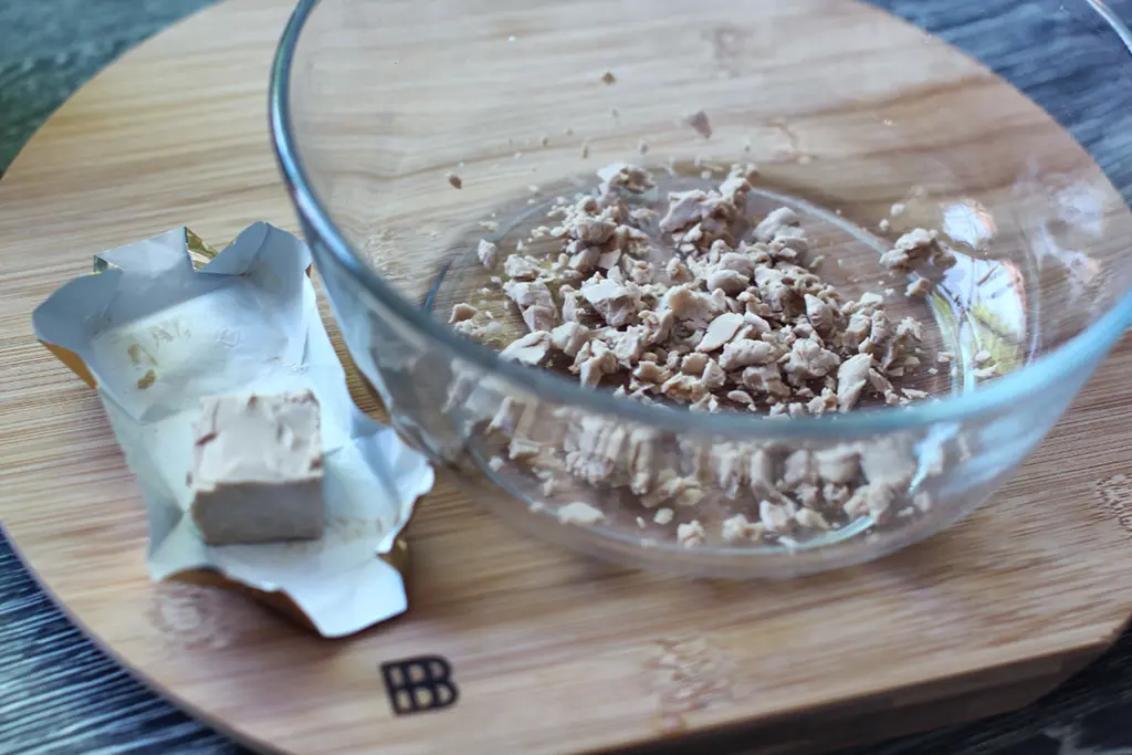 - Frische Hefe zerbröseln und mit einem kleinen Schluck der Mischung übergießen. Hefe glatt rühren und mit restlicher Mischung aufgießen