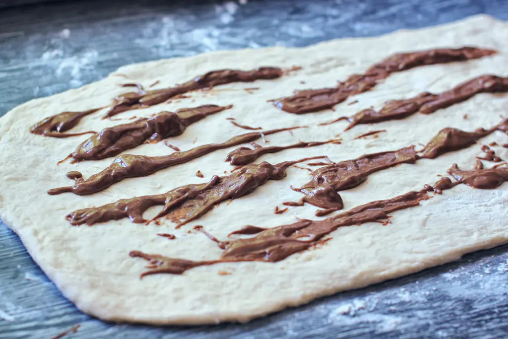 - Teig erst mit Mandelbutter bestreichen, dann mit Zucker und Zimt bestreuen und mit 2 EL geschmolzener Butter beträufeln.